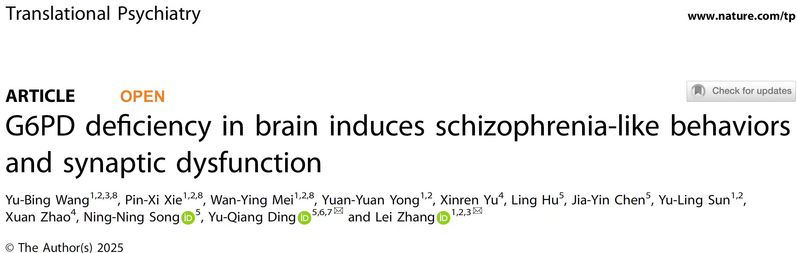 葡萄糖-6-磷酸脱氢酶(G6PD)是磷酸戊糖途径(PPP)中的关键限速酶,通过调控还原型烟酰胺腺嘌呤二核苷酸磷酸(NADPH)的生成,在维持细胞生物合成及氧化还原稳态中发挥核心作用,其在神经保护中的功能已得到广泛认可。近年来的临床研究提示,G6PD缺乏可能与精神分裂症存在关联,但二者之间的因果关系及其潜在生物学机制仍不明确。2025年10月31日,复旦大学实验动物中心丁玉强团队与同济大学医学院张磊团队在《Translational Psychiatry》期刊发表题为“G6PD deficiency in brain induces schizophrenia-like behaviors and synaptic dysfunction”的研究论文。该研究首次在动物模型中证实,脑内特异性G6PD缺乏可直接引发精神分裂症样行为,并揭示其通过破坏突触结构与功能稳态参与疾病发生的关键机制。