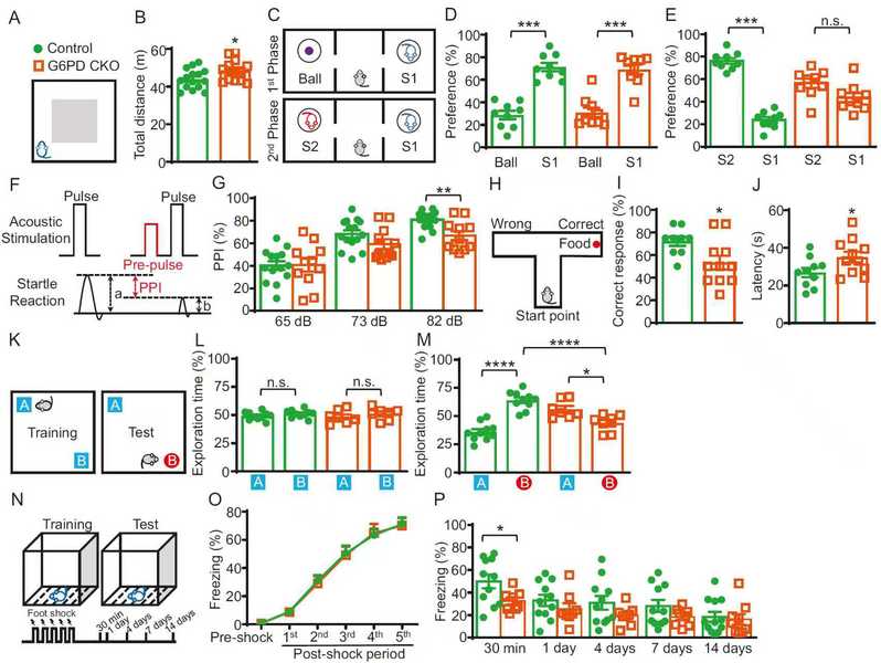 研究人员构建了大脑皮质和海马区特异性G6PD基因敲除(CKO)小鼠模型,有效模拟了G6PD缺乏的病理状态,表现为小鼠脑组织中G6PD蛋白表达及酶活性显著下降,并伴随氧化还原平衡紊乱。行为学评估显示,CKO小鼠表现出多动、社交功能障碍、感觉运动门控缺陷以及认知记忆损害等典型精神分裂症样表型,而焦虑样、抑郁样行为及空间学习记忆能力未见明显异常。进一步研究发现,G6PD主要富集于突触前终末;在CKO小鼠中,突触前囊泡密度减少,突触后致密区长度发生改变,SNARE复合物组装受到抑制,树突棘密度降低,突触结构与功能完整性受损,提示突触稳态遭到破坏。该研究系统阐明了脑内G6PD缺乏通过影响突触可塑性导致神经精神功能障碍的分子机制,为理解精神分裂症的发病机理提供了新的视角。